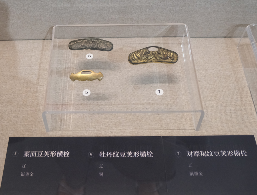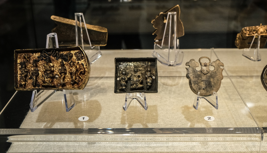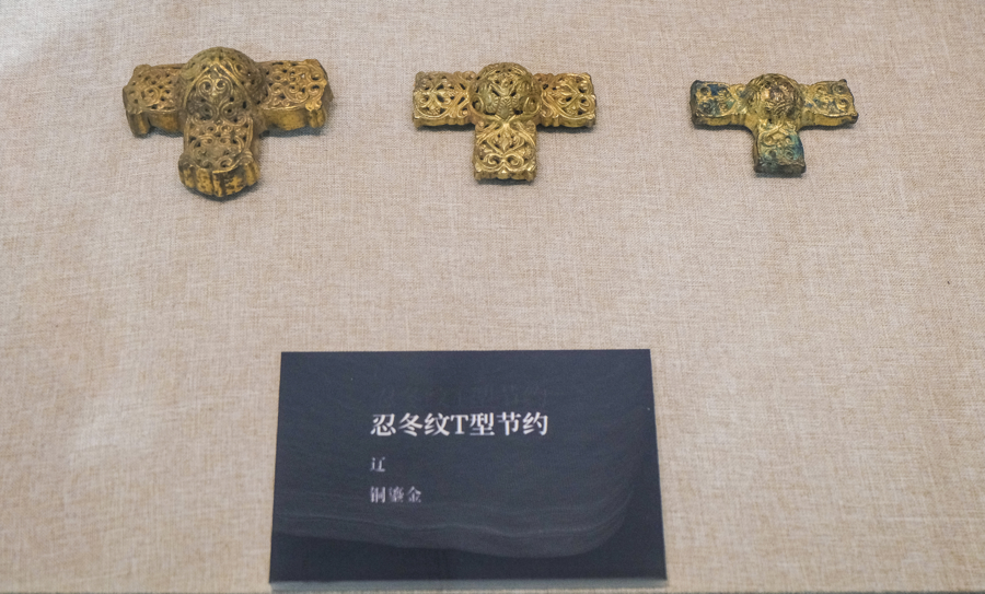左、中:西王母祝寿纹带銙、将军祝寿纹带銙 朝代:宋 材质:铜鎏金 右:瑞雀纹荷包带饰 朝代:辽 材质:铜