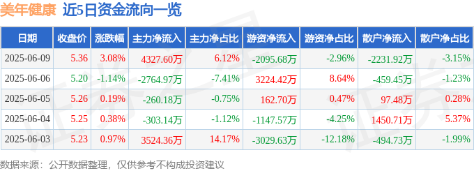 本站消息,截至2025年6月9日收盘,美年健康(002044)报收于5.36元大鑫优配资讯,上涨3.08%,换手率3.41%,成交量132.02万手,成交额7.07亿元。